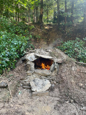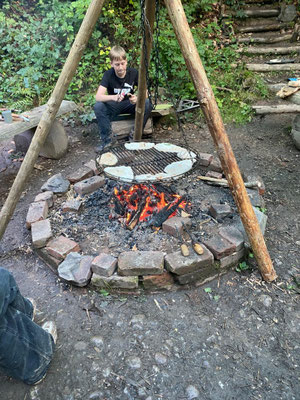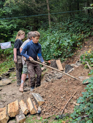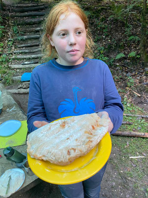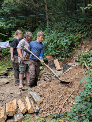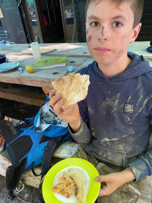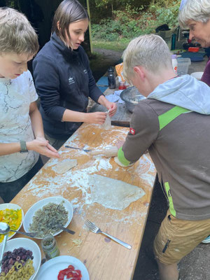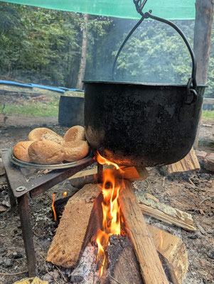Nach dem Frühstück konnte sich jeder kreativ beschäftigen. Wichtigste Aufgabe war es den Lehmofen zu bauen, der dann auch gleich für die Zubereitung des Mittagessens benutzt wurde. Es gab Pizza